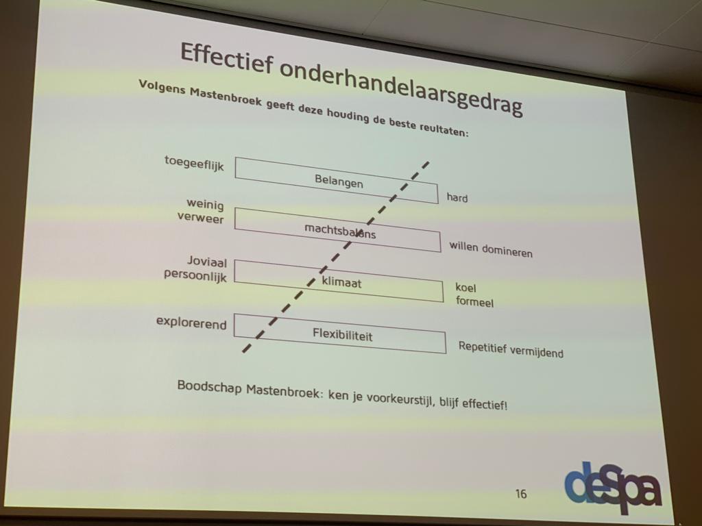 Naast de theorie met onder andere het model van Mastenbroek en de Harvard methode werd geregeld een casus in tweetallen bij de horens gevat. Op deze manier werd de drie uur amusant maar ook uiterst doeltreffend ingevuld met als doel om de grondbeginselen van het onderhandelen te leren kennen.
